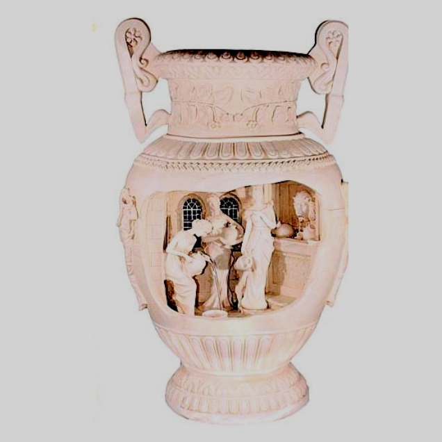 Bahan buatan memungkinkan untuk memberikan produk bentuk yang paling menakjubkan, termasuk meniru tampilan tekstur alami: tanah liat, kayu, batu, perunggu yang dipatenkan, dan sebagainya. Dalam kebanyakan kasus, beton polimer, periuk porselen, polimer halus, dan kaca digunakan untuk membuat karya agung.