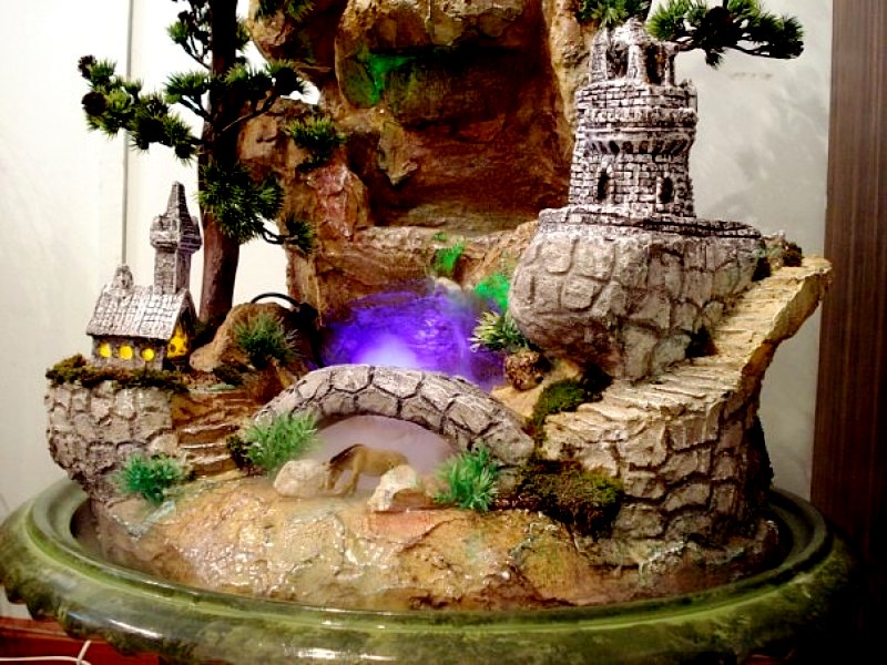Desain sudut dengan dimensi yang mengesankan: 2 * 1,2 * 1,5 m akan menghiasi ruangan apa pun, apa pun tujuannya. Air mengalir dengan lancar di atas tepian. Rumah dan kastil diterangi dengan cahaya redup. Dalam gelap, produk terlihat megah.