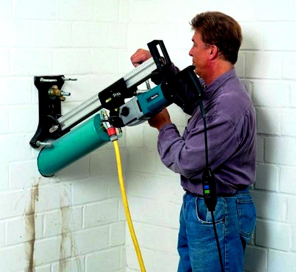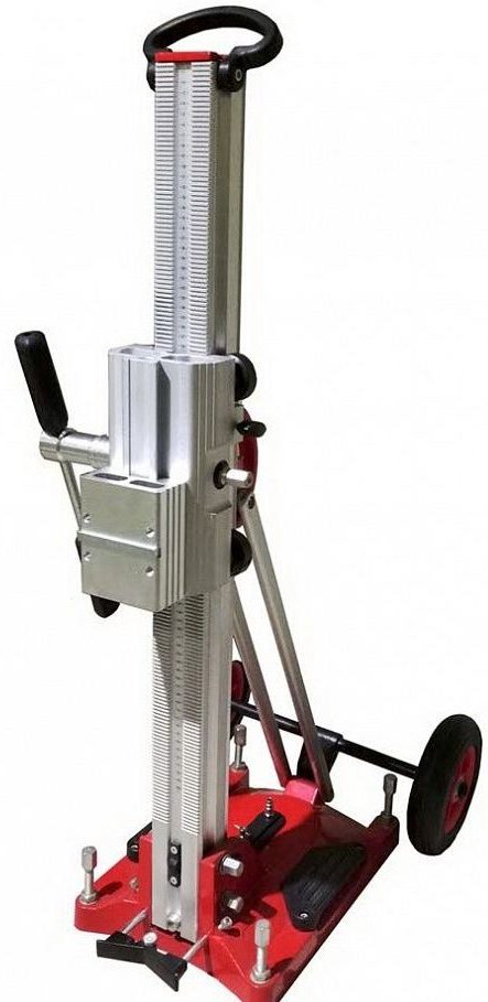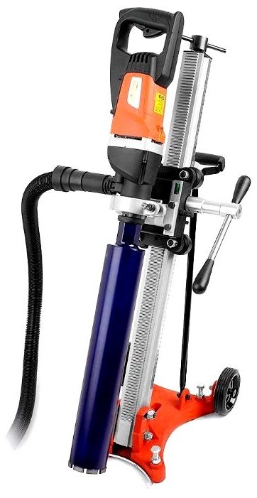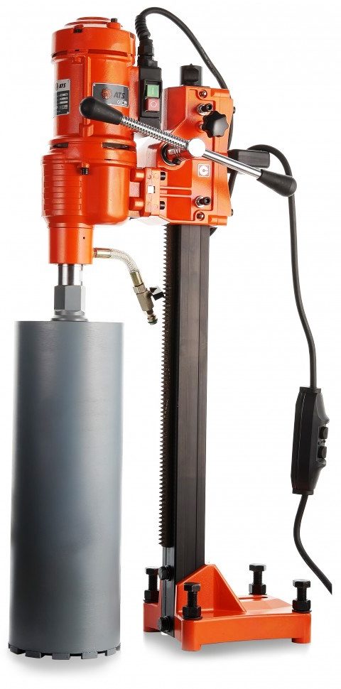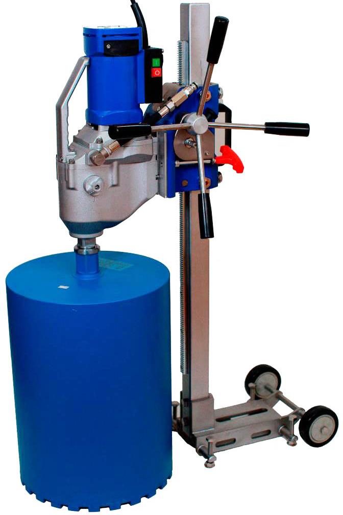 Unit memiliki berat yang signifikan 19 kg, sehingga menjadi perlu untuk memperbaikinya ke dasar stasioner, menggunakan baut jangkar untuk tujuan ini. Mahkota berlian yang dapat dipertukarkan memungkinkan Anda membuat lubang dengan diameter mulai dari 20 hingga 200 mm. Ini berlaku untuk struktur beton dan bata. Pada beton bertulang, dimungkinkan untuk membuat lubang dengan diameter lebih dari 180 mm.