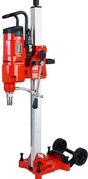 Peralatan yang cukup andal dan berkualitas tinggi yang diproduksi oleh produsen untuk pengeboran berlian. Dayanya 3300 W, ada tiga mode operasi kecepatan tinggi. Memungkinkan Anda membuat lubang pada struktur beton bertulang dengan diameter maksimum 35,2 cm. Perangkat ini juga dilengkapi dengan pendingin air dan pompa tangan khusus. Karena bobotnya yang agak besar 34,5 kg, unit dipasang di rak, yang bobotnya mencapai 19 kg. Anda dapat secara mandiri memilih mode kecepatan optimal, yang ada tiga: 1200, 800 dan 400 putaran per menit.