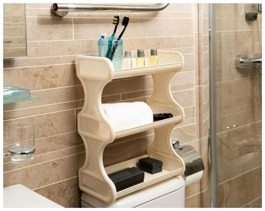- Rak plastik. Pilihan ringkas sederhana yang tahan kelembaban dan kebal terhadap deterjen. Ini membuatnya mudah digunakan, jadi kotoran sederhana cukup untuk diseka dengan kain lembab, dan ketika kapur muncul, Anda dapat menggunakan bahan kimia rumah tangga dengan aman. Rak plastik mempertahankan warnanya untuk waktu yang lama, berfungsi sebagai tambahan yang praktis dan indah.