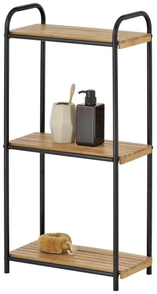 Kesenjangan yang cukup besar di antara mereka akan memungkinkan Anda untuk mengatur toples dan tabung dengan sampo dengan ukuran berbeda. Bambu adalah bahan dasar yang ramah lingkungan, tahan terhadap air dan uap, dan lapisan khusus akan melindungi badan baja. Pada bagian pendukung furnitur ini yang bersentuhan dengan lantai, terdapat nozel plastik yang mencegah goresan pada ubin.