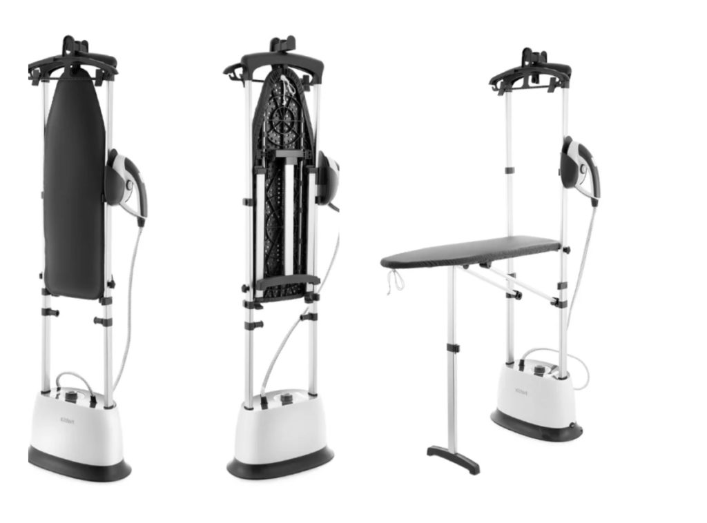 Ada gantungan untuk pakaian luar dan jas. Sebuah pemanas dibangun ke dalam tapak setrika. KT-940 juga dilengkapi dengan reservoir 1 liter - cukup untuk operasi terus menerus selama 30 menit.