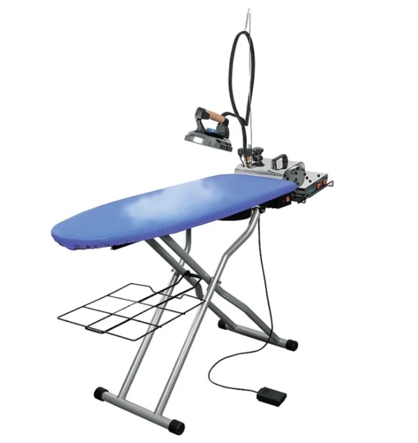 Sistem menyetrika modern dengan generator uap, papan, dan setrika. Kit ini mencakup platform untuk lengan, nozel, perahu, palet, gantungan baju, sarung tangan, dan aksesori pelindung lainnya.