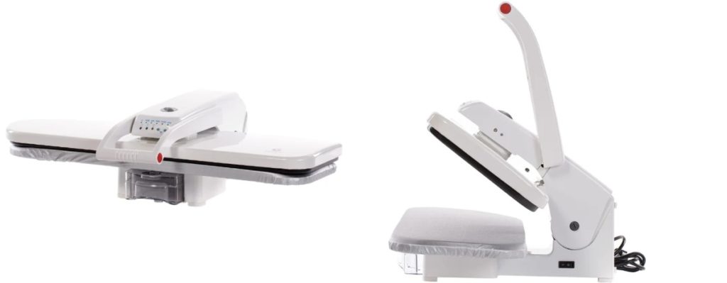 Dilengkapi dengan vakum, bertekanan, pemanas. Blower untuk menyetrika dengan lembut disediakan oleh kipas, tudungnya memperbaiki kain dengan aman di permukaan meja.