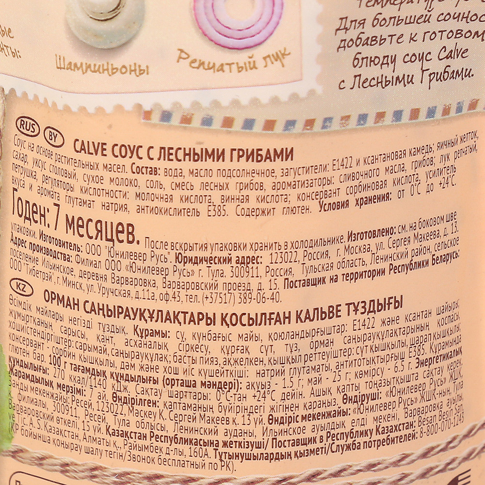 Calve tidak menggunakan rasa jamur yang biasa ditemukan di industri makanan. Ini berisi jamur porcini asli, champignon, dan cendawan, yang potongannya terlihat jelas dalam saus kental. Dengan demikian, rasa produk hanya diuntungkan dari ini: jamur yang kaya, melengkapi nada dasar yang lembut.