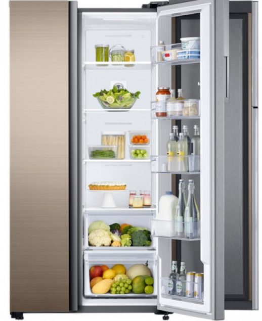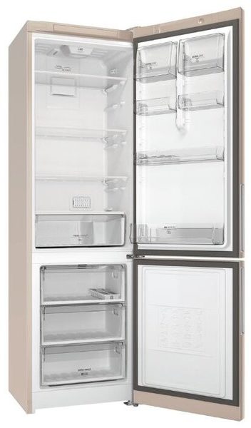 Pencairan freezer dilakukan dengan menggunakan teknologi No Frost. Selain itu, perangkat ini memiliki fungsi "Liburan". Tubuh kulkas terbuat dari logam dan plastik, dan dicat dengan emas mawar.