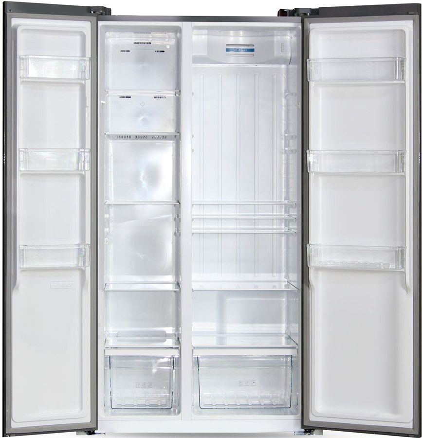 Desain perangkat yang menarik akan menjadi dekorasi nyata untuk dapur apa pun. Kulkas dilengkapi dengan dua pintu yang terbuka ke arah yang berbeda. Selain desain yang tidak biasa, perlu memperhatikan kapasitas besar. Volume ruang pembekuan adalah 172 liter. Volume ini cukup untuk membekukan hingga 12-15 kg produk per hari. Jenis pembekuannya kering, sehingga tidak ada akumulasi es dan es. Pencairan bunga es dilakukan menggunakan fungsi Tanpa Beku