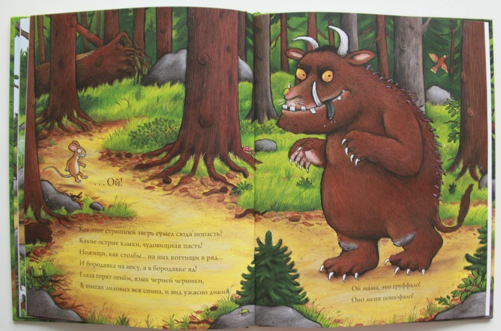 Kisah horor dongeng yang lucu dan jenaka dalam bentuk puitis, yang menceritakan tentang Tikus yang licik, yang, melarikan diri dari rubah, ular, dan burung hantu, menemukan monster bernama Gruffalo - kekasih yang hebat untuk makan bersama rubah, ular, atau burung hantu. Para pemangsa ketakutan, dan Tikus tahu bahwa tidak ada Gruffalo, tetapi benarkah demikian? Kisah lucu dan instruktif tentang akal ini diilustrasikan dengan gambar yang detail dan lucu. Sejarah mengajarkan anak-anak untuk tidak takut pada monster fiksi. Biaya rata-rata sebuah buku adalah 344 rubel.