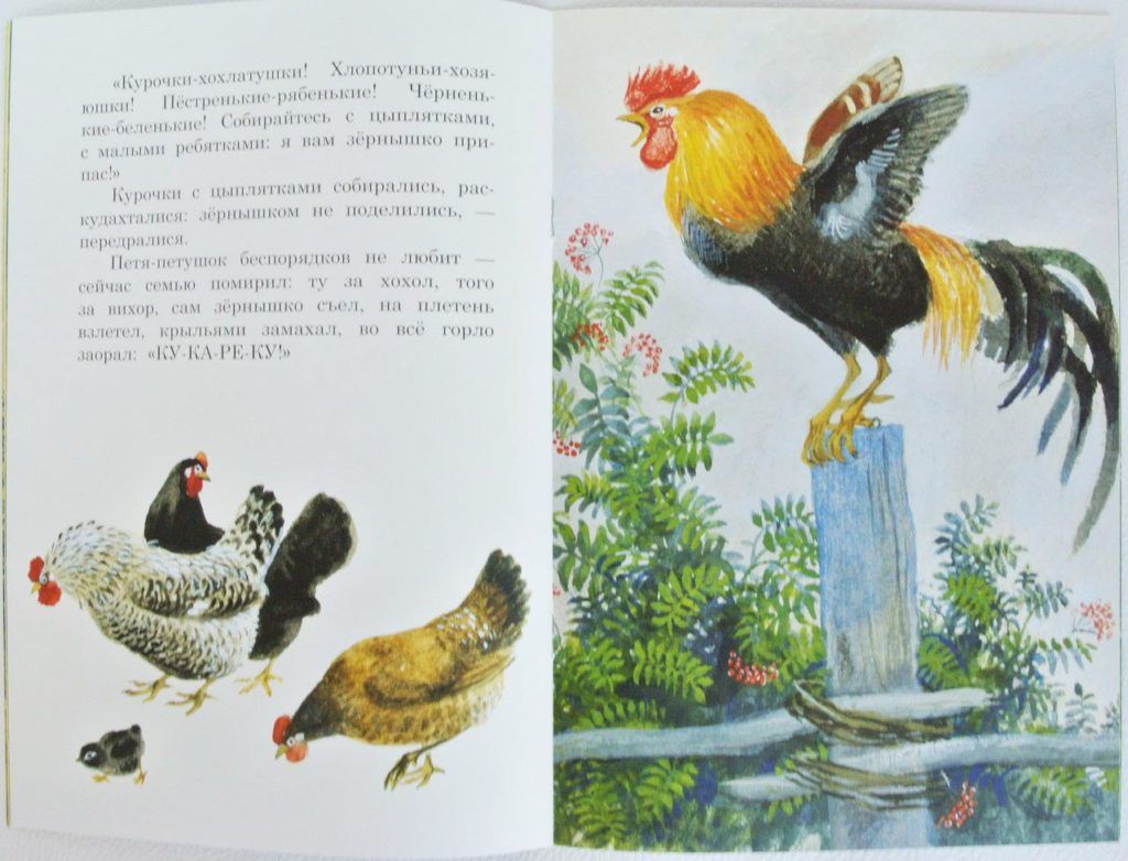Ilustrasi. Sebuah komponen penting dari buku anak-anak, karena anak-anak belajar memahami apa yang mereka baca dalam hubungannya dengan apa yang mereka lihat, dengan kata lain, gambar harus menjelaskan atau melengkapi teks. Selain itu, gambar membantu mengembangkan perhatian, memberikan gambaran tentang warna, corak, bentuk, dan dunia di sekitar kita, sehingga penting agar gambar berwarna sealami mungkin. Selain itu, ilustrasi berkualitas tinggi menyebabkan kenikmatan estetis.