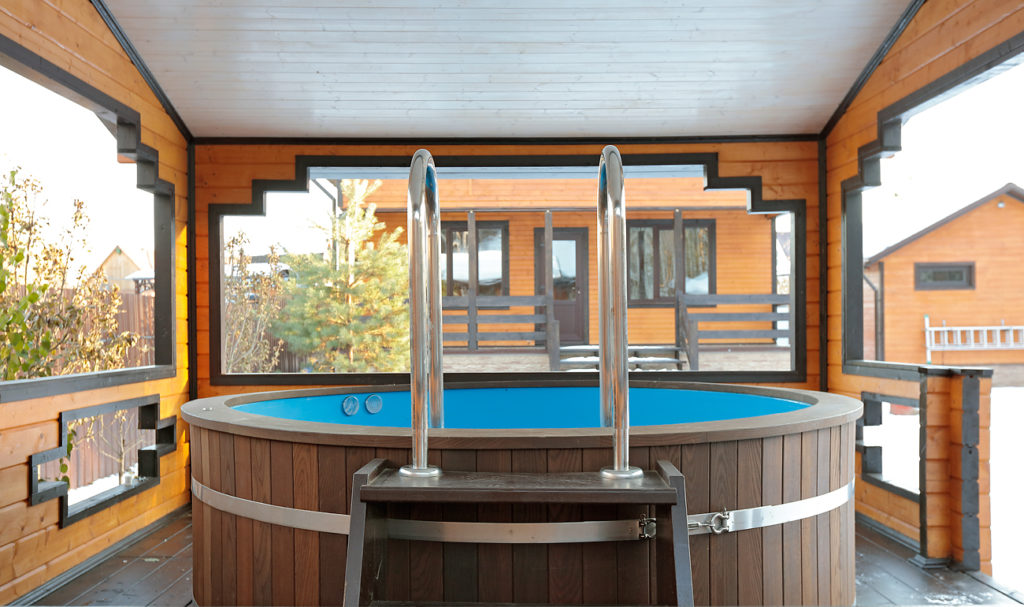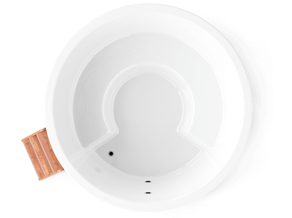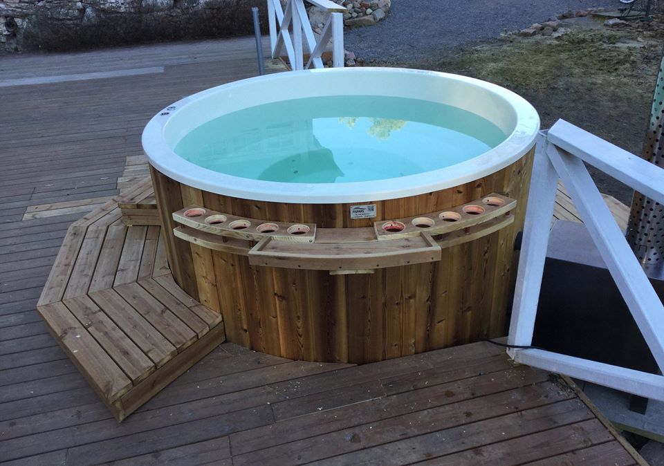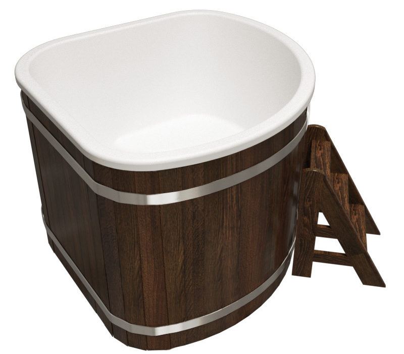 Dengan mangkuk plastik yang dilapisi dengan lamela cedar, dengan tangga dan sistem pembuangan yang nyaman. Cocok untuk rumah pribadi dan usaha. Dapat dipasang di luar ruangan dan di dalam ruangan.