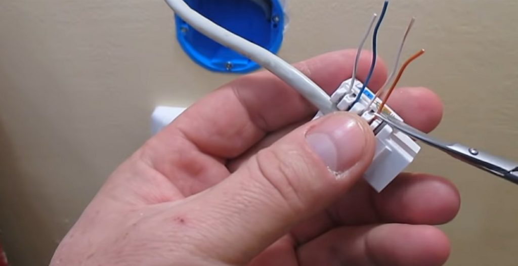 Ujung kabel sepanjang 5-6 cm telanjang, menghindari kerusakan pada insulasi, tidak diperlukan pemrosesan tambahan. Tingkatkan setiap pasangan secara terpisah. Panel depan dilepas dari badan produk dengan membuka baut pemasangan atau memutar tuas ke posisi terbuka di soket dengan fiksasi. Menurut warnanya, semua inti terhubung, mencoba membenamkannya lebih dalam, dan ujungnya diperbaiki dengan baut.