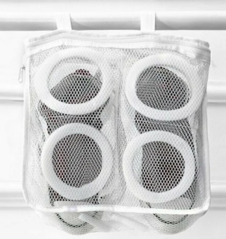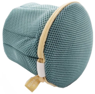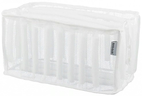 Wadah terbuat dari kain yang dapat bernapas, udara yang mengalir dengan baik, yang penting saat pengeringan, serta air dan busa untuk efek maksimal. Jaring ganda melindungi agar tidak jatuh dari bagian-bagian kecil, menangkap partikel kecil kotoran tanpa menyumbat drum. Biaya: 699 rubel.