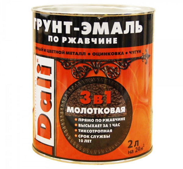Produk dari pabrikan dalam negeri untuk perawatan permukaan besi cor, baja, non-ferrous atau galvanis langsung pada logam dan karat. Memberikan efek "palu". Dengan fungsi mengubah korosi, primer, juga enamel dekoratif. Ini memiliki sistem perlindungan tiga tahap - penghalang, anti korosi, tapak.
