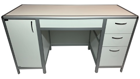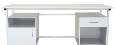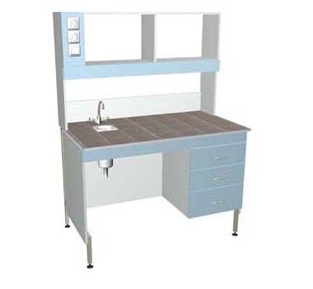 Meja tipe tertutup dengan wastafel stainless steel kecil, faucet, sisi aluminium di bagian atas dan superstruktur tempat lampu neon dipasang, sakelar satu geng, stopkontak yang diarde dan biasa. Di bawah ini adalah alas berengsel dengan beberapa laci pada pemandu rol.