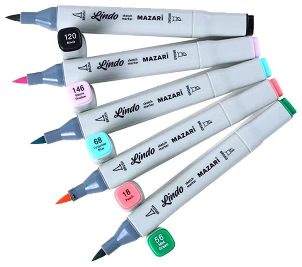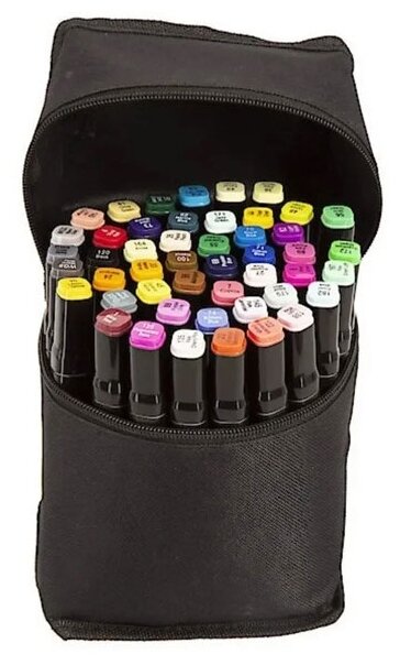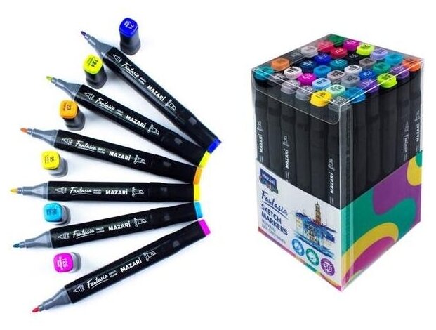 Set ini mencakup 36 spidol berbasis alkohol dua sisi, lebar garis yang dihasilkan: 1-7 mm. Ujungnya berbentuk peluru dan berbentuk baji.