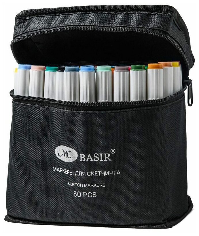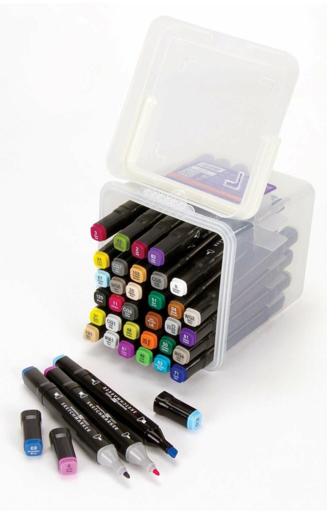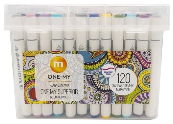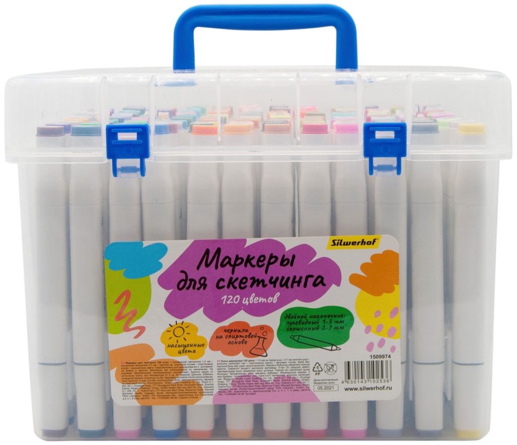 Dalam kotak transparan plastik yang nyaman, yang memiliki tutup dengan pegangan pembawa, ada 120 spidol, yang tintanya dibuat berdasarkan alkohol. Tubuh spidol berwarna putih, ada indikator warna di tutupnya.