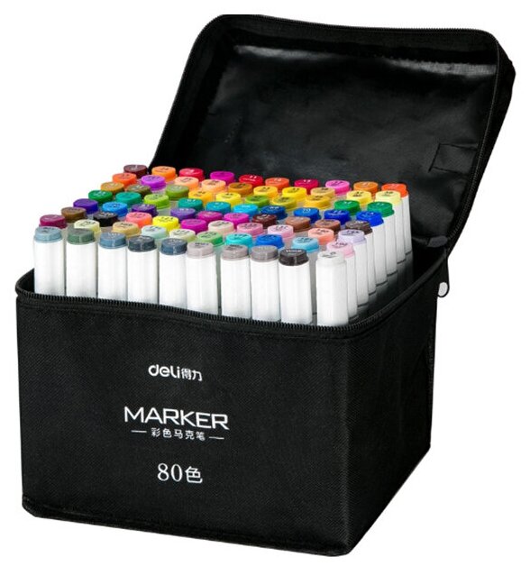 Spidol dua sisi berbasis alkohol dibuat di pabrik-pabrik terkemuka di Cina. Satu set 80 bunga dalam kotak plastik putih ditempatkan di dalam tas tekstil dengan kunci. Seperti kebanyakan alat tulis serupa, tutupnya mencerminkan warna tinta. Tip di sini standar - tipis dan miring.