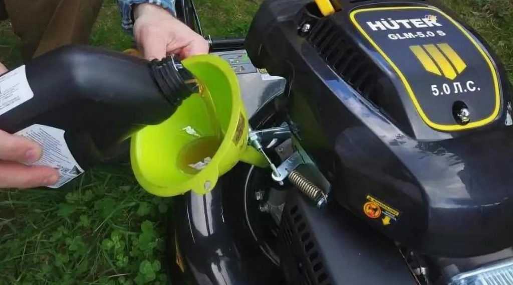 Untuk mesin pemotong rumput dengan mesin empat langkah, pelumas harus dituangkan ke dalam lubang khusus di bak mesin, dan bensin ke dalam tangki yang sesuai. Petunjuk pengoperasian untuk setiap mesin pemotong rumput gas tertentu berisi rekomendasi mengenai frekuensi penggantian pelumas. Namun, harus diingat bahwa efektivitas pelumasan berkurang setelah sekitar 50 jam operasi total mesin. Dalam kasus di mana diperlukan untuk memotong area kecil, maka bahkan dalam satu musim begitu banyak jam kerja tidak dapat diakumulasikan. Ini berarti bahwa pelumas perlu diganti hanya untuk mengawetkan perangkat untuk musim dingin.
