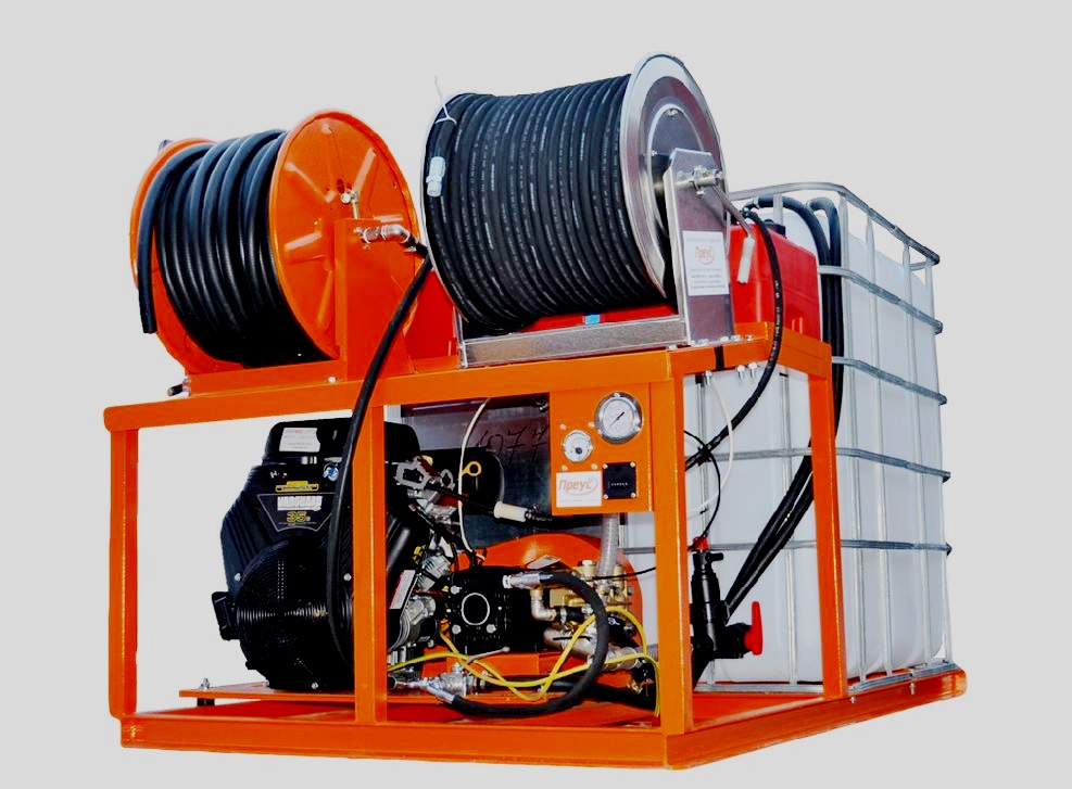 Sepertinya pompa air bertekanan tinggi. Dilengkapi dengan motor bensin atau listrik.Elemen struktural utama adalah selang dengan panjang yang berbeda, di ujungnya dipasang nosel. Karakter utama: