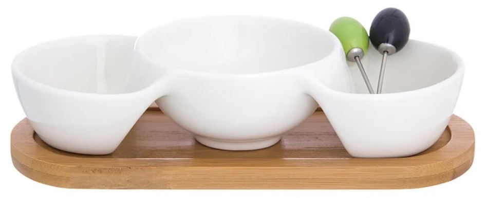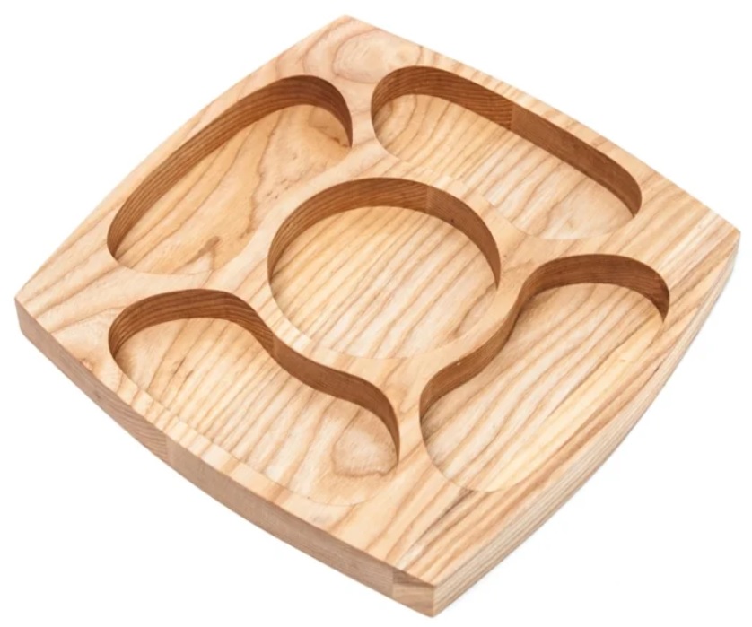 Piring persegi dengan lima bagian terpisah, terbuat dari kayu ash dan dilapisi dengan minyak goreng. Kompartemen tengah sangat cocok untuk menempatkan saus di dalamnya, di kompartemen lain Anda dapat menyajikan makanan apa pun: makanan ringan, keju, zaitun, kacang-kacangan, manisan buah-buahan, buah-buahan kering, permen. Menjadi bagian dari penyajian, Drevmade Quintet akan menghiasi meja apa pun tidak hanya di rumah, tetapi juga di kafe atau restoran. Sedangkan untuk perawatan produk, disarankan untuk mencucinya dengan tangan, dengan spons yang lembut, tanpa menggunakan produk yang bersifat abrasif. Panjang dan lebar penyajian - 24,7 cm, tinggi - 2,8 cm Tersedia dalam warna terang dan gelap dari kayu alami. Biaya rata-rata adalah - 1.040 rubel.