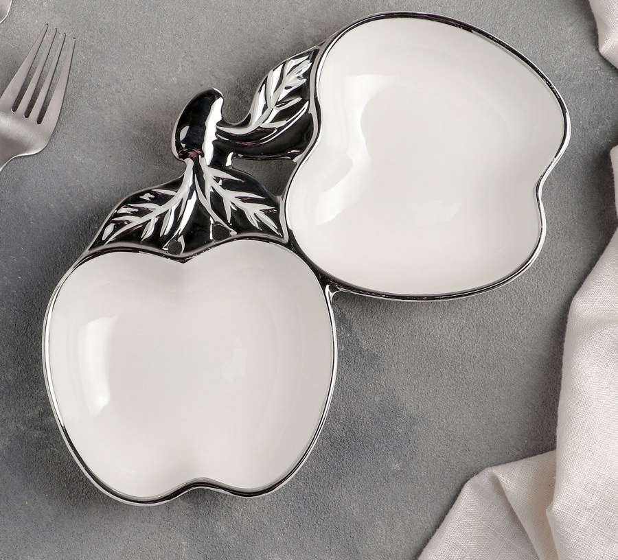 Hidangan spektakuler yang dibagi menjadi dua modul dalam bentuk bagian apel, daun dan tepinya berwarna perak. Terbuat dari keramik putih berkualitas. Cocok untuk menyajikan buah zaitun, kacang-kacangan, buah-buahan kering, manisan dan manisan. Mangkuk BONUS sama baiknya untuk penggunaan sehari-hari di rumah dan penyajian yang meriah. Juga, produk akan menyenangkan sebagai hadiah. Piring memiliki dimensi kecil, tinggi dan lebar 16 cm, panjang komposisi 25 cm, biaya rata-rata 490 rubel.