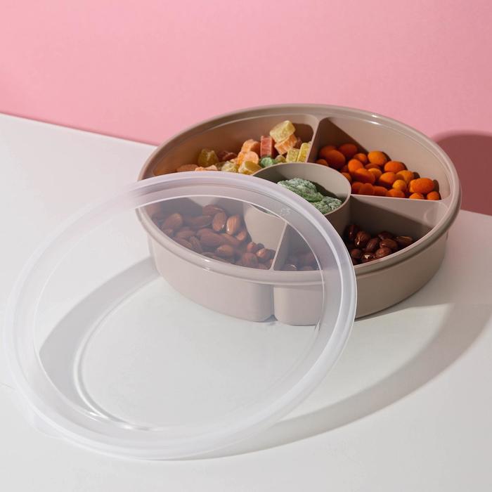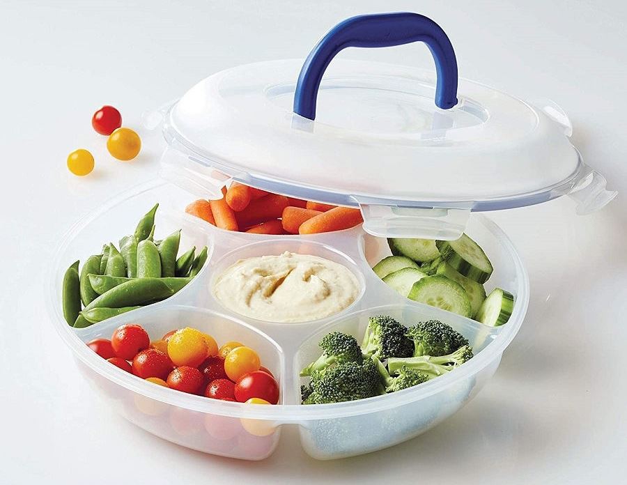 Piring besar lima bagian dengan penutup, terbuat dari plastik food grade (busa). Empat kompartemen memiliki kapasitas 400 mm, yang kelima - 220 ml. Mereka dapat menampung hidangan dingin dan panas (makanan ringan, salad, keju, zaitun, kacang-kacangan, dan bahan-bahan lainnya). Partisi kompartemen tinggi, sehingga komponen tidak bercampur. Juga, dalam hidangan seperti itu Anda dapat menyajikan hidangan utama dengan berbagai pilihan saus. Set untuk item penyajian termasuk tutup yang terbuat dari bahan yang sama, yang menjaga kesegaran produk. Laci Ide dapat dicuci di mesin pencuci piring. Biaya rata-rata adalah 291 rubel.