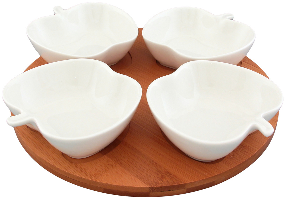Terbuat dari bahan berkualitas tinggi, model ini memiliki alas putar bulat dan empat bagian terpisah berbentuk apel. Stand terbuat dari bambu alami. Setiap modul memiliki volume 120 ml, dapat dengan mudah dilepas dari dudukannya dan digunakan secara terpisah. Produk ini ramah lingkungan, dan desain luarnya yang tidak biasa akan menghiasi interior. Galeri Elan "Apple" cocok untuk menyajikan salad, makanan ringan, lauk pauk, serta permen dan makanan penutup, kacang-kacangan. Dimensi model adalah - 25 cm (diameter), 6 cm (tinggi). Biaya rata-rata adalah 650 rubel.