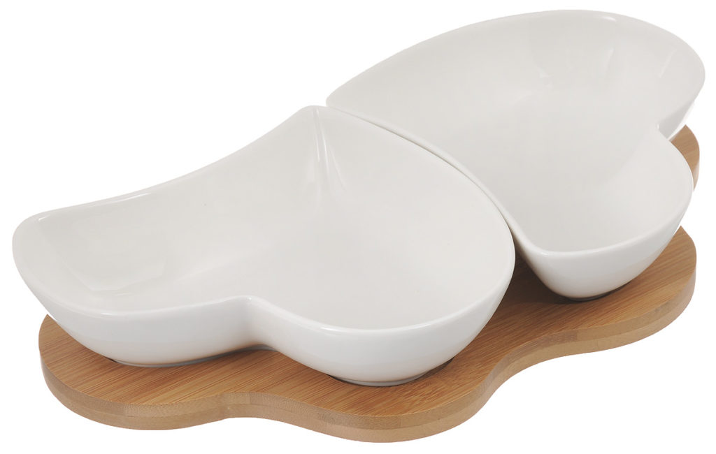 Ini terdiri dari dua cangkir dengan bentuk hati yang romantis, dipasang di atas dudukan bambu. Produk ini cocok untuk sebagian besar jenis hidangan. Modul dapat dengan mudah dilepas dari dudukannya dan digunakan secara terpisah sebagai mangkuk salad atau vas untuk kacang dan permen. Galeri Elan "Hati" dapat digunakan dalam kehidupan sehari-hari, serta untuk menghias meja pesta. Karena bentuknya, produk ini akan menjadi hadiah romantis yang bagus. Dimensi barang - 30 cm (panjang), 15 cm (lebar), 5 cm (tinggi). Biaya rata-rata adalah - 681 rubel.