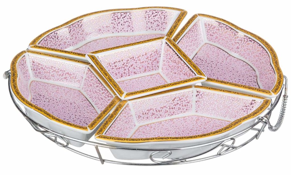 Lemari porselen berdiameter 30 cm berbentuk bulat dilengkapi dengan stand metal yang elegan. Produk stylish ini tersedia dalam dua pilihan warna - baby blue dan pink, dengan pinggiran emas dan pola berupa mosaik berkilau. Model Lefard dibagi menjadi 5 kompartemen, sama-sama cocok untuk mendekorasi meja pesta dan makanan sehari-hari. Piring menyajikan berbagai jenis makanan ringan dan hidangan, acar, saus, kacang dan produk lainnya. Kemasan produknya juga berwarna-warni, sehingga cocok dijadikan sebagai hadiah. Biaya rata-rata adalah - 1.728 rubel.
