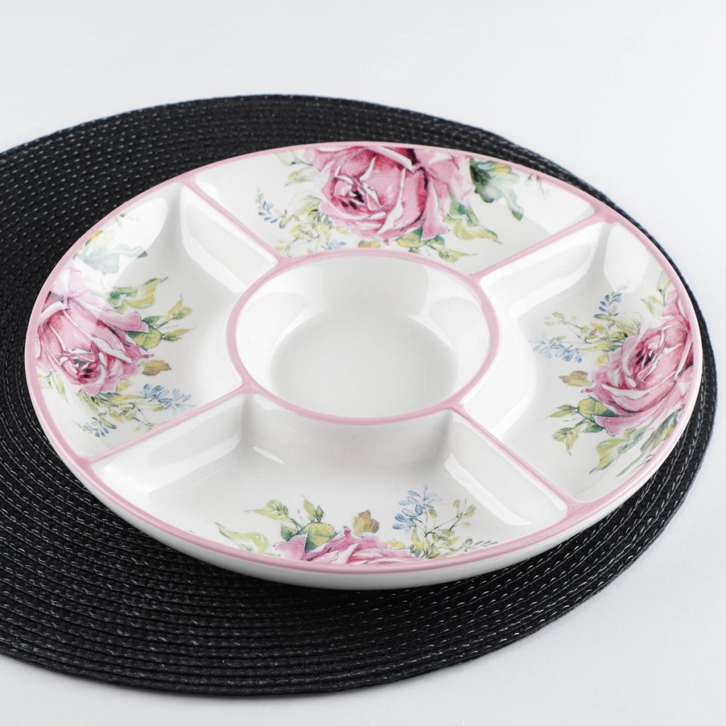 Piring datar dengan bagian tengah terbuka dan beberapa kompartemen di sekitarnya baik untuk menyajikan roti gulung atau sushi.