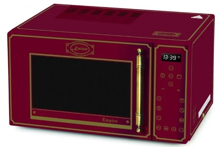 Peralatan dapur berdiri bebas warna merah anggur dengan pegangan berlapis emas untuk pintu berengsel terlihat kaya. Oven ini dilengkapi dengan panggangan kuarsa dan konveksi. Microwave dengan sakelar sentuh, lampu kamera, dan suara. Set dilengkapi dengan rak panggangan. Dari program ada: memasak dan mencairkan es otomatis, mode pencairan standar.