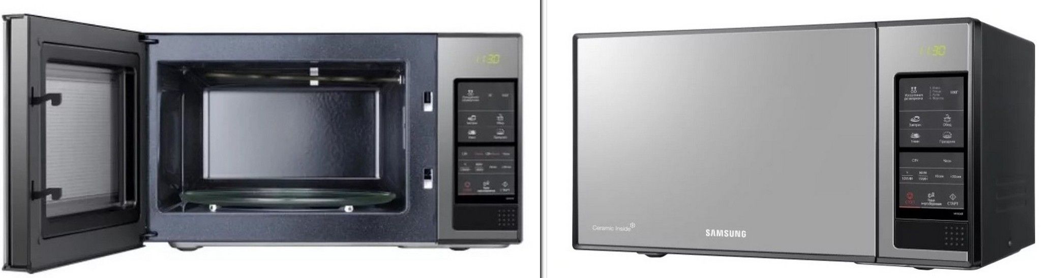 Keuntungan utama dari lapisan keramik adalah sifat antibakteri yang dimilikinya. Juga, makanan yang dipanaskan dalam microwave seperti itu tidak menempel di dinding oven.