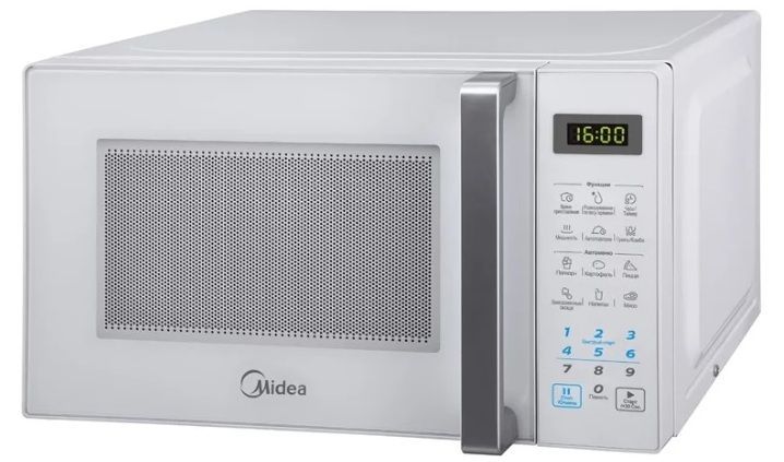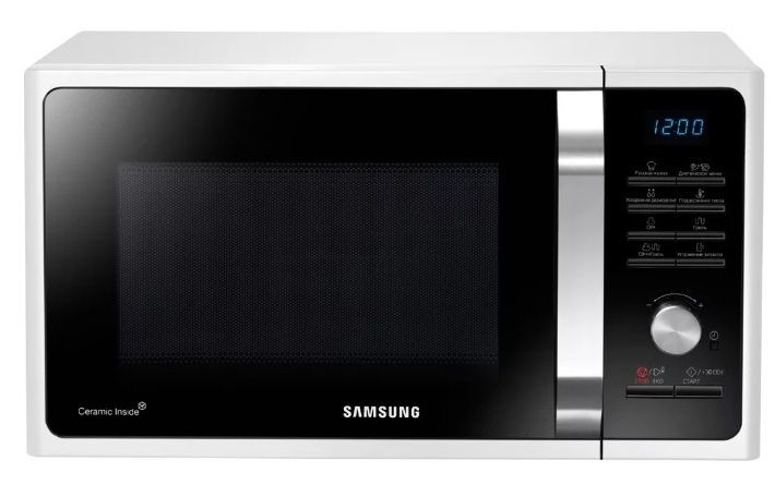Tubuh model putih meliputi: sakelar tombol tekan, pintu berengsel dengan pegangan, dan fungsi audio. Bagian dalam microwave meningkatkan umur oven. Semua ulasan pelanggan murni positif. Modelnya disukai karena kualitasnya, kecepatan persiapan, dan banyak modenya.