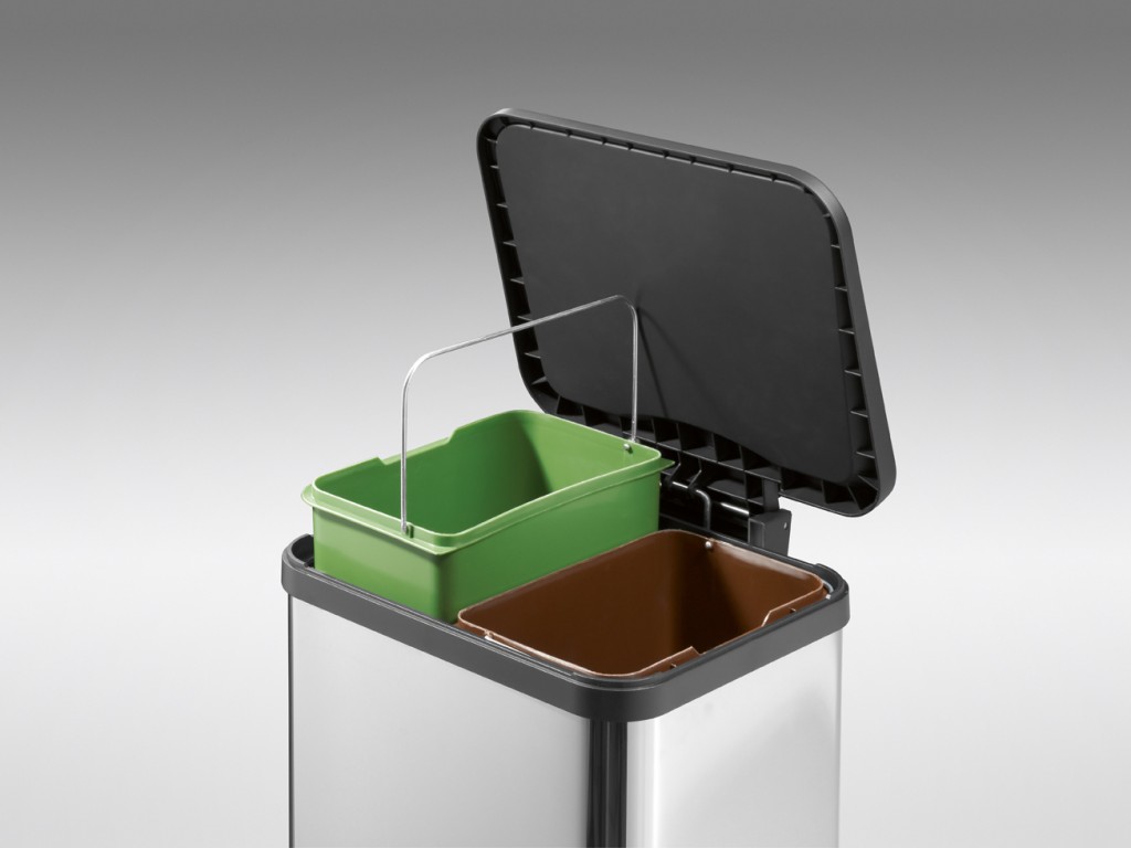 Model tempat sampah ini dilengkapi dengan mekanisme yang memungkinkan Anda untuk membuka dan menutup tutupnya secara diam-diam hanya dengan menekan satu tombol.