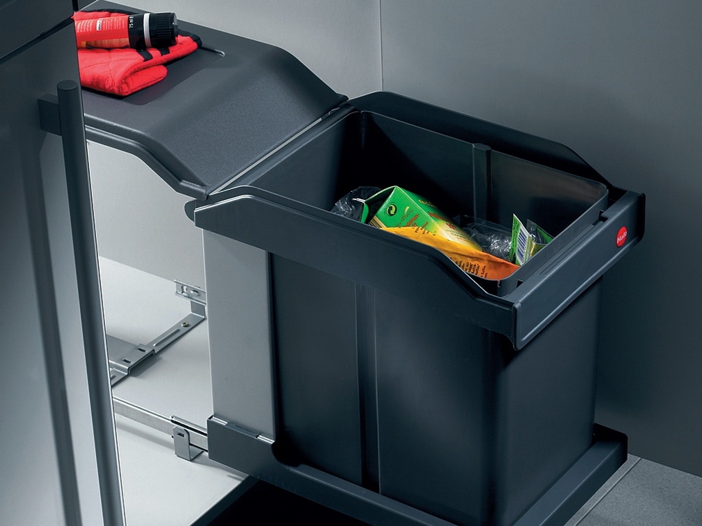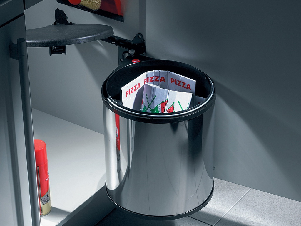 Yang paling nyaman untuk dapur adalah tempat sampah yang bisa ditarik. Mereka tersembunyi dari pandangan, tidak memakan banyak ruang. Mereka ditempatkan dalam modul yang dirancang khusus untuk ini. Sesuai kebutuhan, mereka "pergi" dari bawah meja, setelah itu mereka dengan bebas bersembunyi kembali.