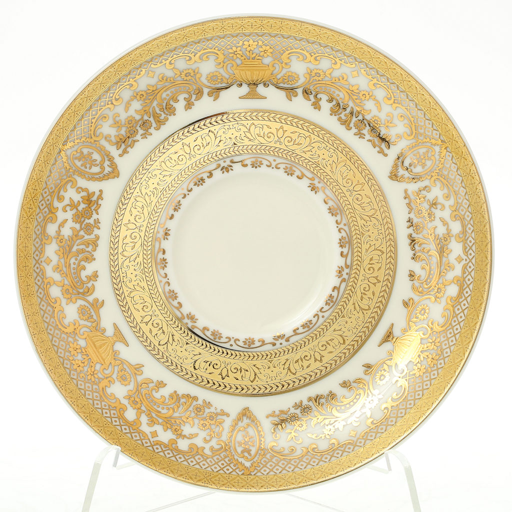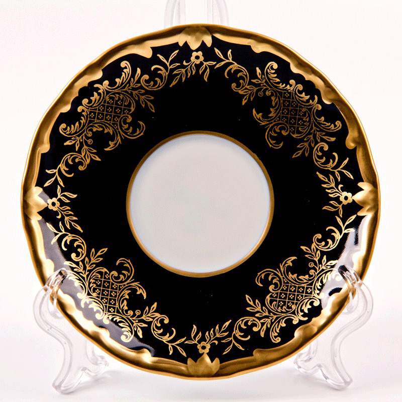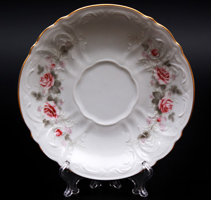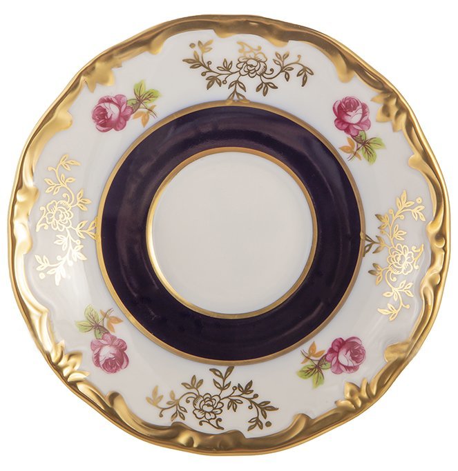 Set "Anna Amalia" dirancang untuk 6 orang dan terdiri dari piring bundar dengan diameter 150 mm, dihiasi di sekitar tepinya dengan bunga hias berlapis emas.