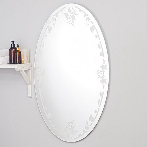 Model asli dari brand RetailMarket dengan gambar sandblasted dari sulur di sekitar seluruh lingkar produk cermin cocok untuk dipasang di kamar mandi. Tidak memiliki bingkai tambahan.