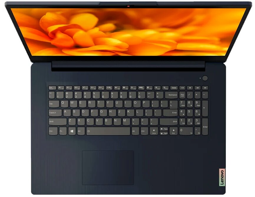 Desain - warna baja, tombol keyboard hitam, tampilan. Layar 17,3 inci, standar Full HD, efek anti-silau, bezel sempit.