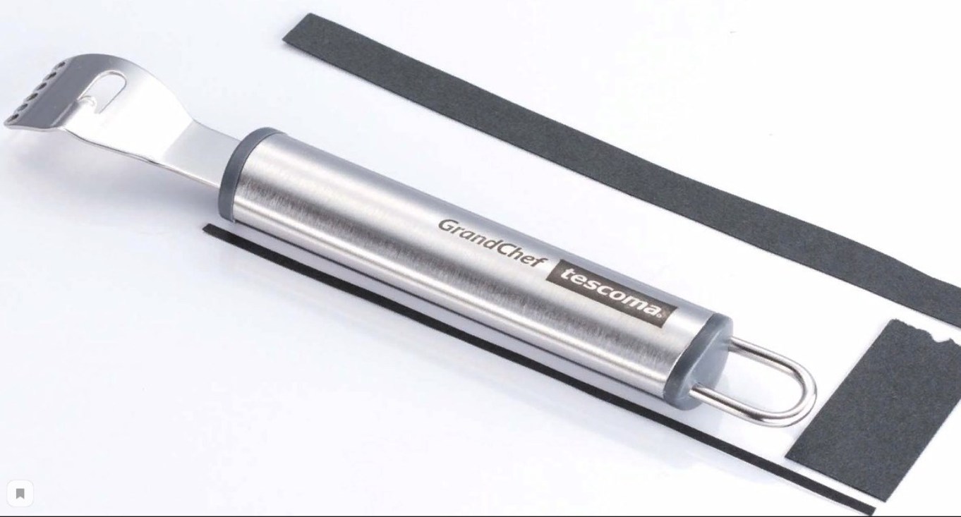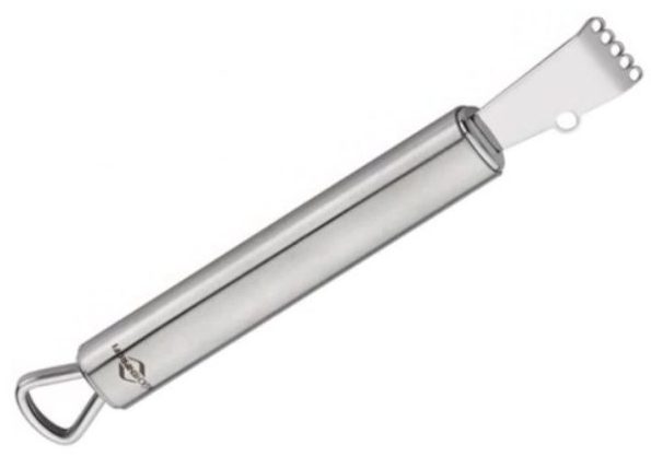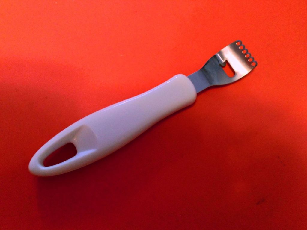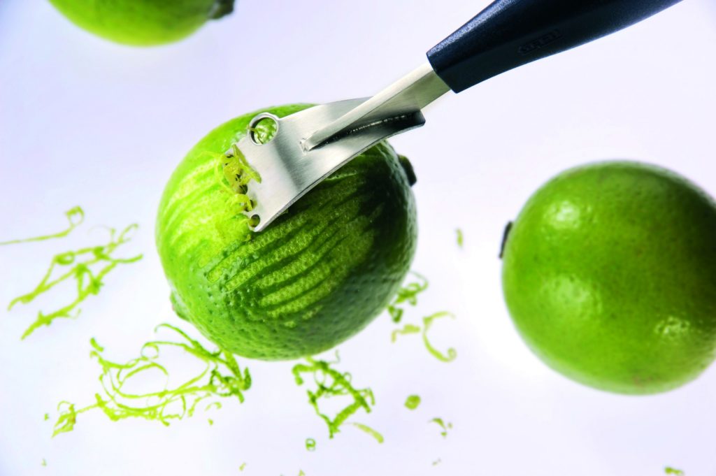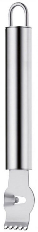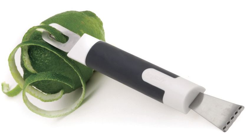 5 lubang kecil dan tajam pada pisau memotong kulit jeruk menjadi remah-remah kecil, yang dapat ditambahkan ke hidangan apa pun. Dan lubang di bagian atas bilah membantu membuat sedotan dari kulit atau ikal. Dimensi: 18,5 × 5,5 × 1,6 cm Berat hingga 40 g.