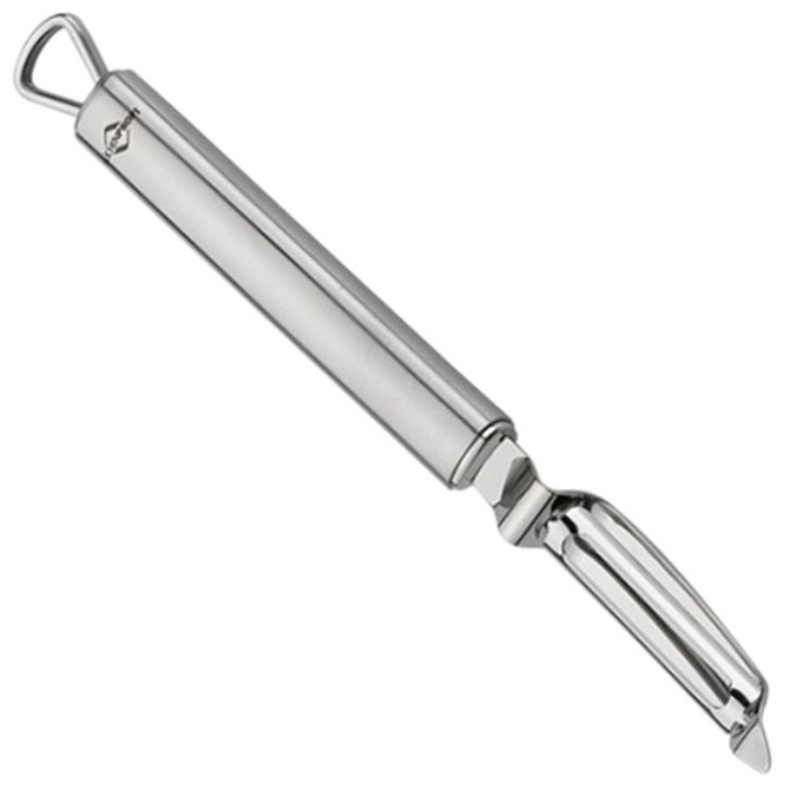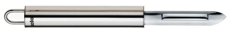 - Pengupas, yang paling mudah digunakan, dengan pisau lurus atau segitiga kecil, terkelupas dengan sempurna. Seringkali produk tersebut memiliki fungsi tambahan, seperti membagi menjadi irisan dan menghilangkan biji dari pulp.