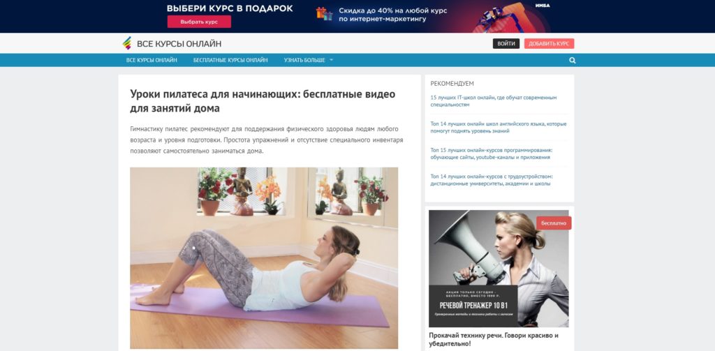 Situs populer All Courses Online menyediakan banyak pilihan video berbeda dari you-tube. Kompilasi Pilates ini direkomendasikan untuk pemula, karena tidak memiliki beban daya yang besar, yang hanya akan merusak tubuh yang tidak siap untuk mereka. Latihan dilakukan oleh pelatih dan instruktur terkenal, menjelaskan cara melakukannya dengan benar.
