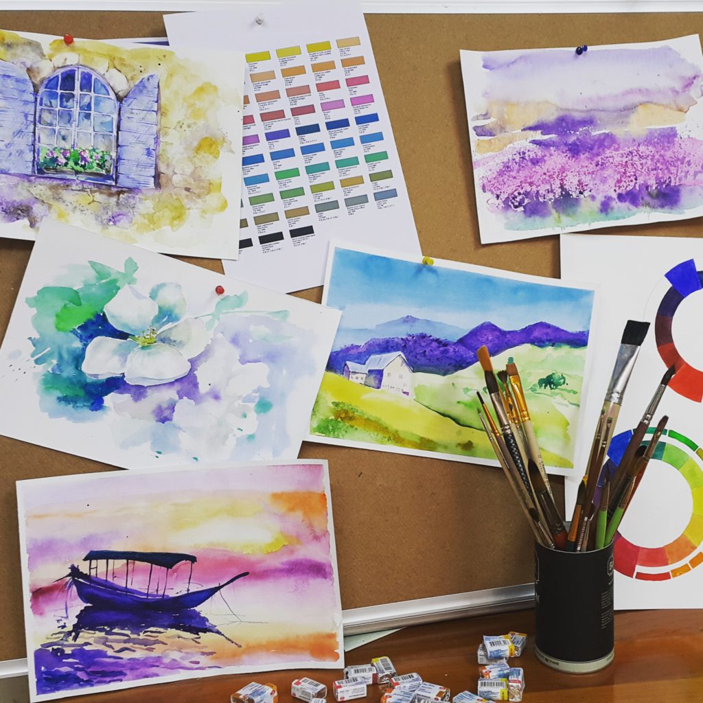 Kursus cat air dasar memberikan dasar serta pengetahuan teoretis yang diperlukan. Kit ini mencakup konsep-konsep seperti roda warna, gambar lukisan, perencanaan, beberapa teknik cat air dianalisis. Seorang siswa yang menyelesaikan semua tugas akan memiliki portofolio dengan 10-20 karya di tangannya, ini akan memungkinkannya untuk berkembang ke arah yang kreatif di masa depan. Biaya: 2700 rubel.