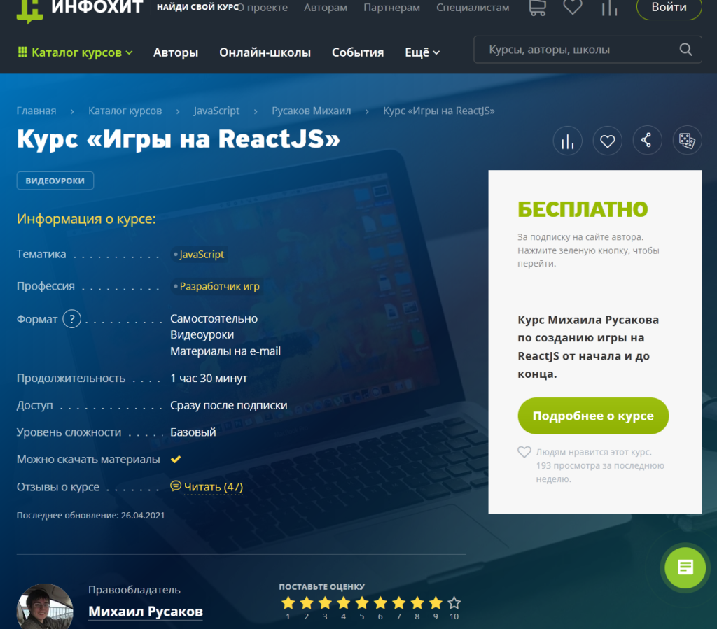 Setelah menyelesaikan kursus penulis ini, pembuatan dunia virtual di ReactJS akan tersedia dan nyata. Untuk mendapatkan akses ke materi - manual elektronik - siswa hanya perlu menulis emailnya. "Game dengan ReactJS" cocok untuk pemula, tetapi pengembang berpengalaman juga dapat menambah pengetahuan mereka. Manual tidak hanya berisi dasar teoritis, dasar adalah contoh nyata. Pengembangan ini dibangun di atas javascript ES6, selain itu, tentu saja menunjukkan keunggulan dan kemampuan perpustakaan untuk menulis aplikasi (ReactJS).