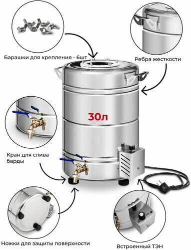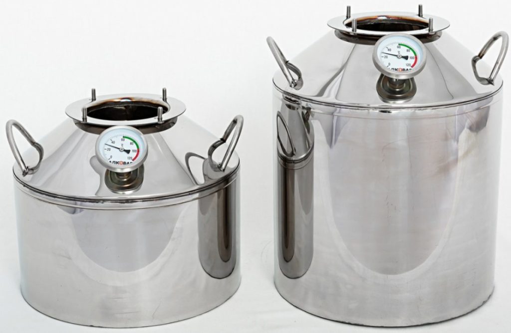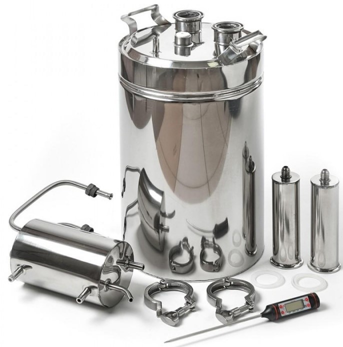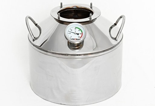 Kubus kecil untuk kompor gas cocok untuk digunakan pada penyulingan nabati pada dudukan berulir 3/8. Bagian bawah non-magnetik, halus dengan pengaku tambahan untuk stabilitas. Tutup berulir, paking karet food grade. Ketebalan dinding: 0,8 mm. Dilengkapi dengan termometer bimetal. Volume kubus distilasi: 25 liter. Harga: 5999 rubel.