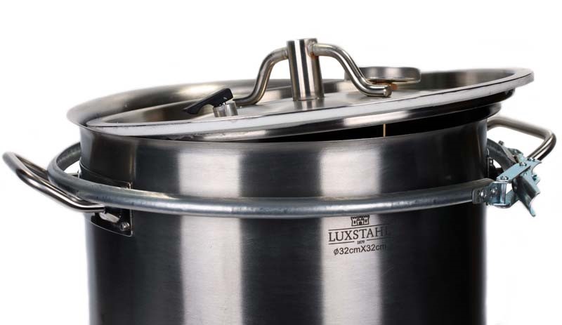 Tutup model dilengkapi dengan outlet penjepit 1,5 inci dan selongsong untuk memasang termometer digital. Bagian bawah diperkuat, dengan pengaku. Gasket silikon ramah lingkungan memastikan keamanan maksimum selama proses distilasi. Tangan terletak di samping, jangan memanas selama operasi. Harga: 7990 rubel.