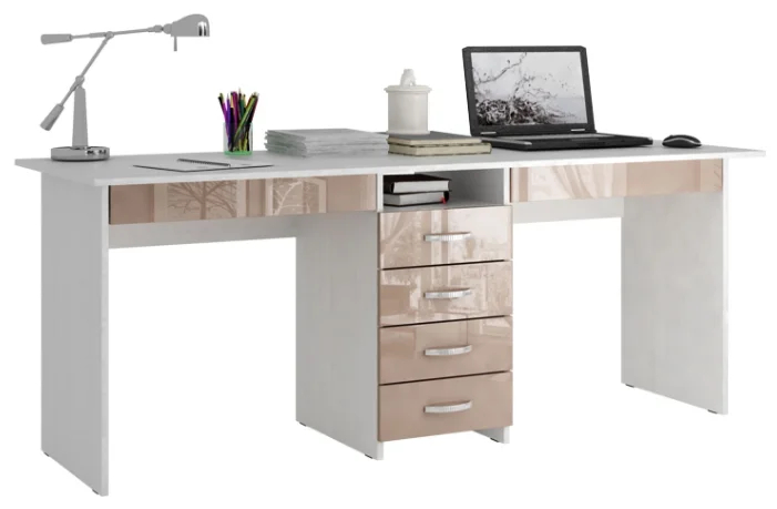 Meja merek furnitur Rusia "MF Master", yang memungkinkan dua orang bekerja atau belajar secara bersamaan. Setiap orang memiliki tempat kerja penuh mereka sendiri. Dengan latar belakang seorang lajang, barang rumah tangga ini unik.