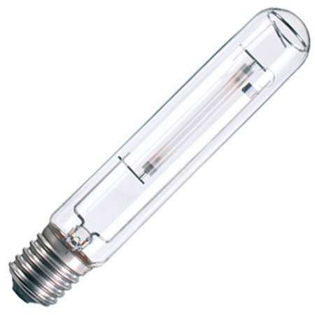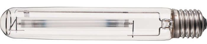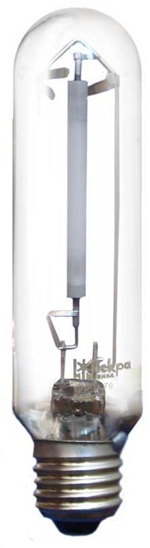 Busur natrium, bentuk tabung. Daya - 400 W dengan panjang 278 mm. Ukuran pangkalan E40 menentukan tujuannya - penerangan jalan, perusahaan, bangunan umum seperti stasiun, pasar. Lingkup penggunaan - di tempat-tempat yang tidak memerlukan transmisi cahaya tinggi.