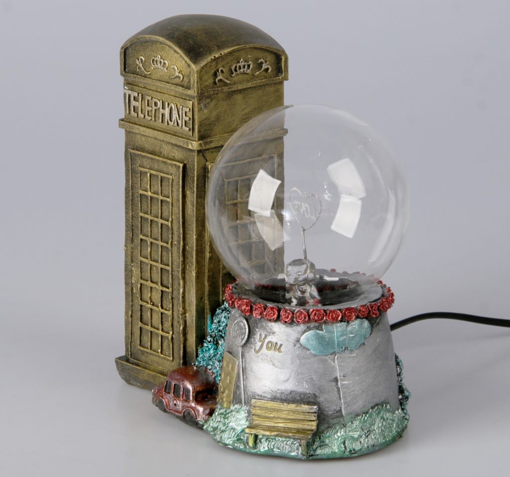Dasar lampu dan bilik telepon yang berdiri di sampingnya terbuat dari plastik dengan tiruan perunggu. Bagian atas silinder, tempat bola dipasang, dihiasi dengan mawar. Di bawah dindingnya ada elemen dekoratif dalam gaya Inggris - rumput, bangku mobil.