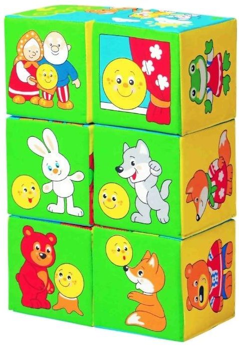 Kubus tekstil berukuran agak besar, dengan sisi 10 cm, dengan adegan cerah dari dongeng favorit mereka tentang roti, lobak, dan menara tidak akan membuat anak-anak acuh tak acuh. Mereka benar-benar aman, dan bahkan jika pecah, pengisi holofiber tidak akan membahayakan remah-remah.